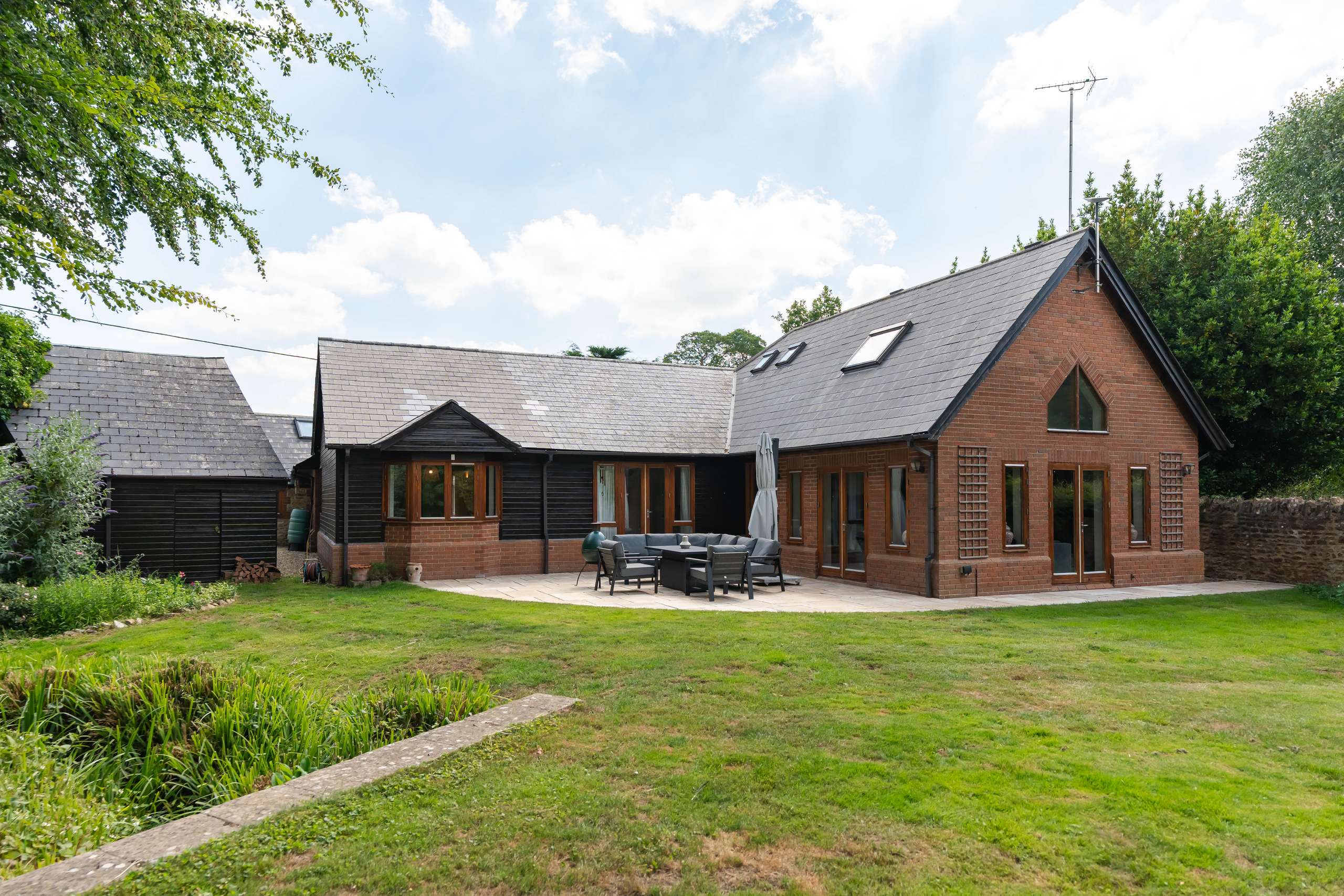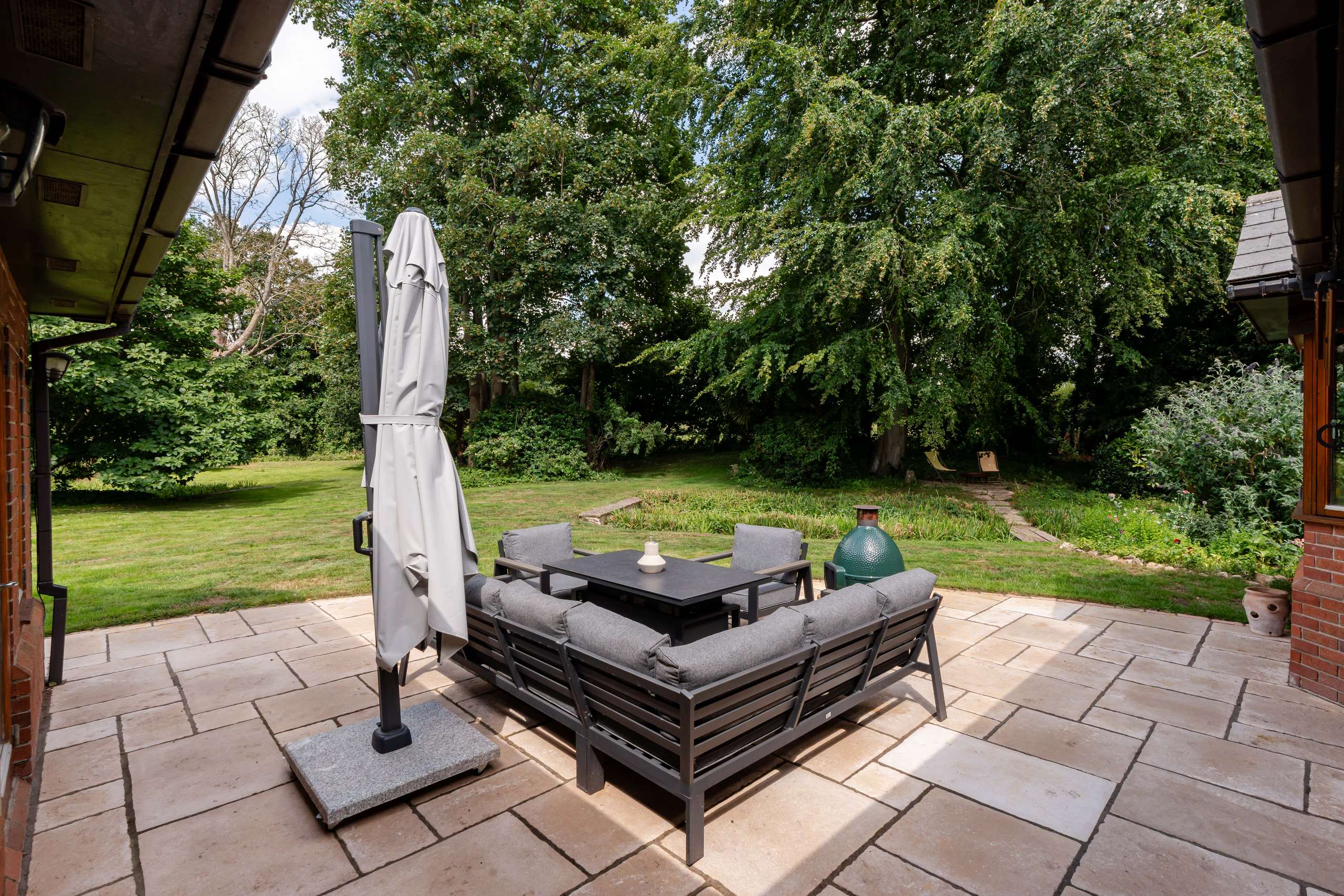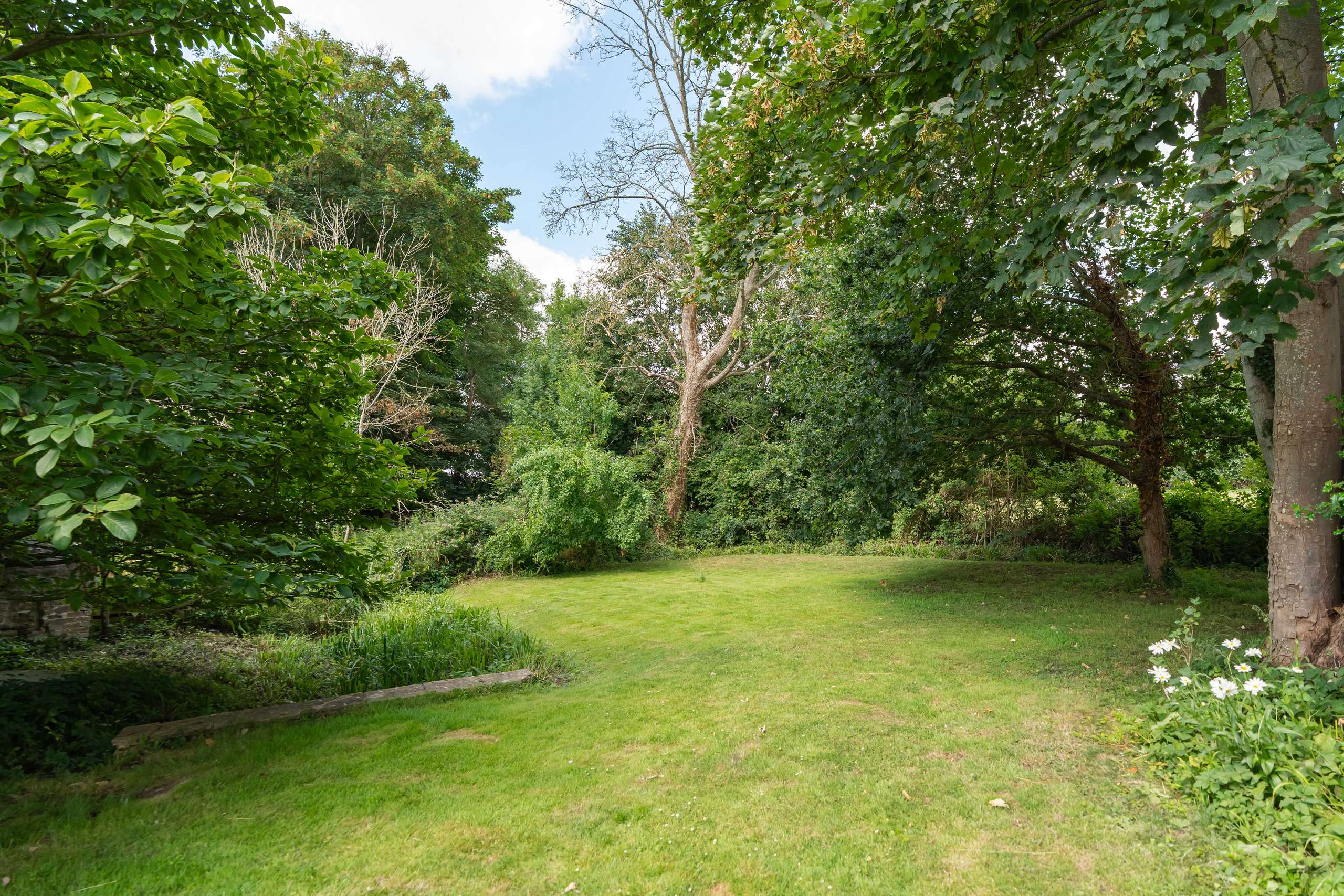 • Beautiful mature rear gardens, with patio, lawn, stream, bushes, flowers and trees.