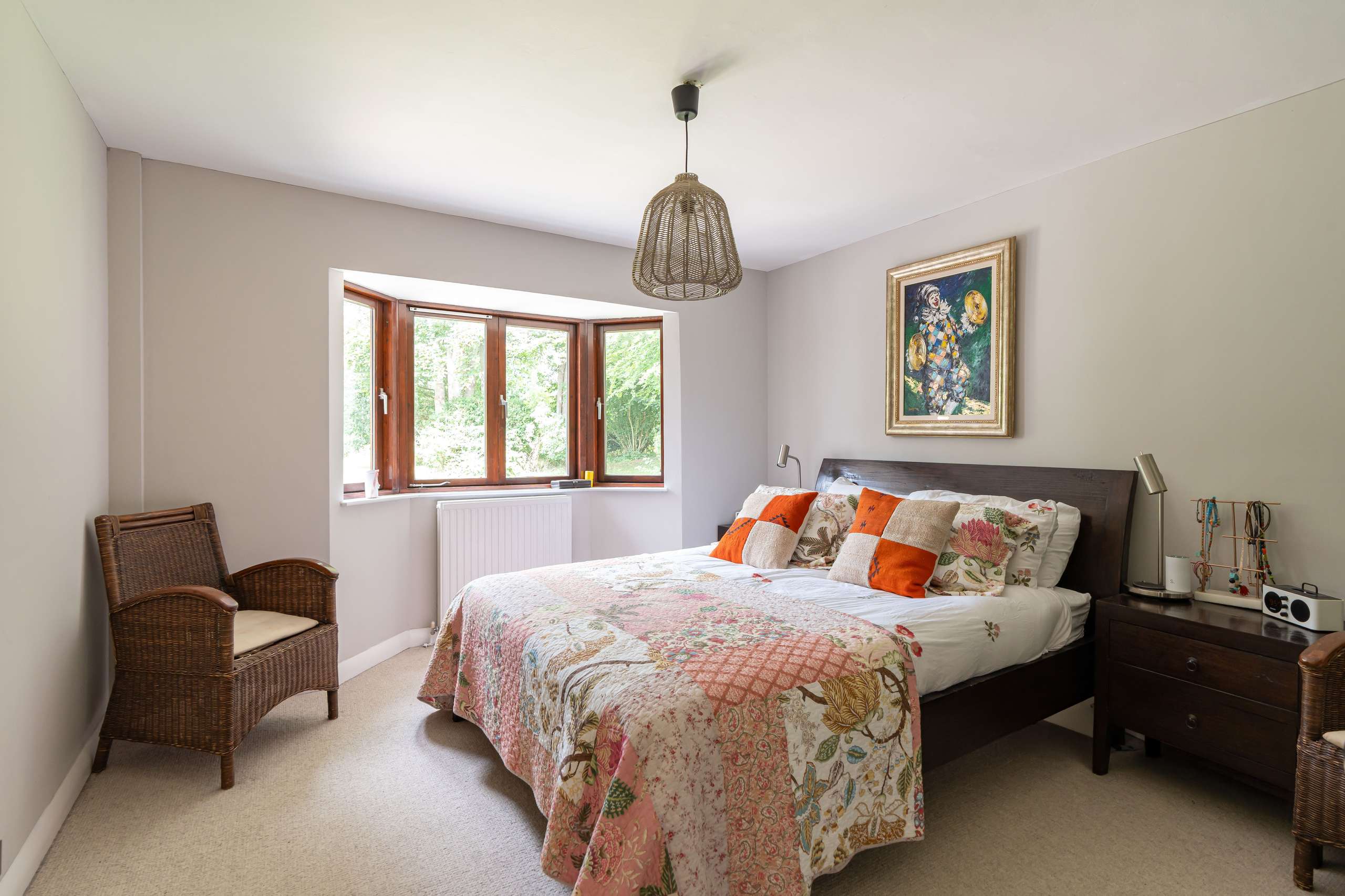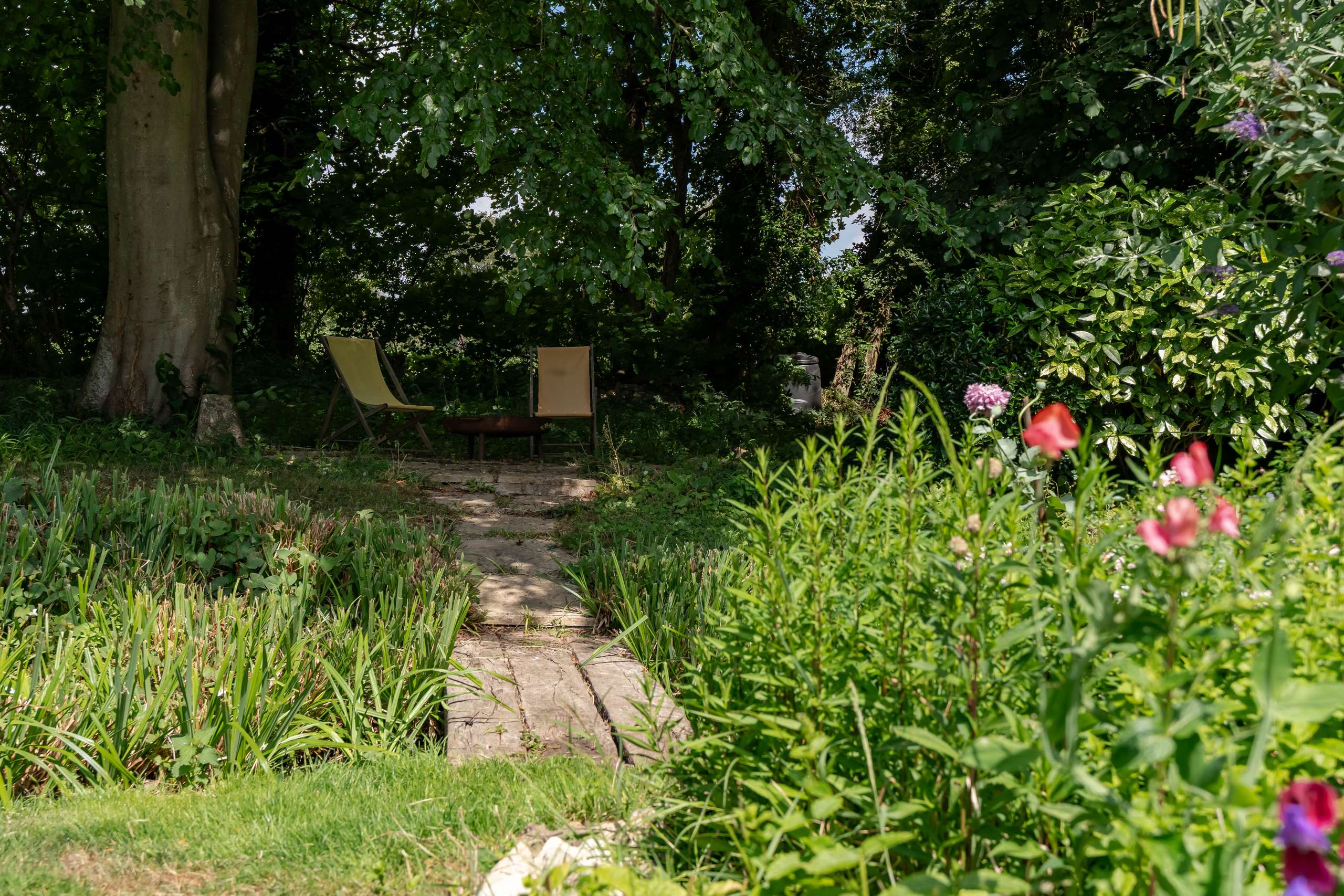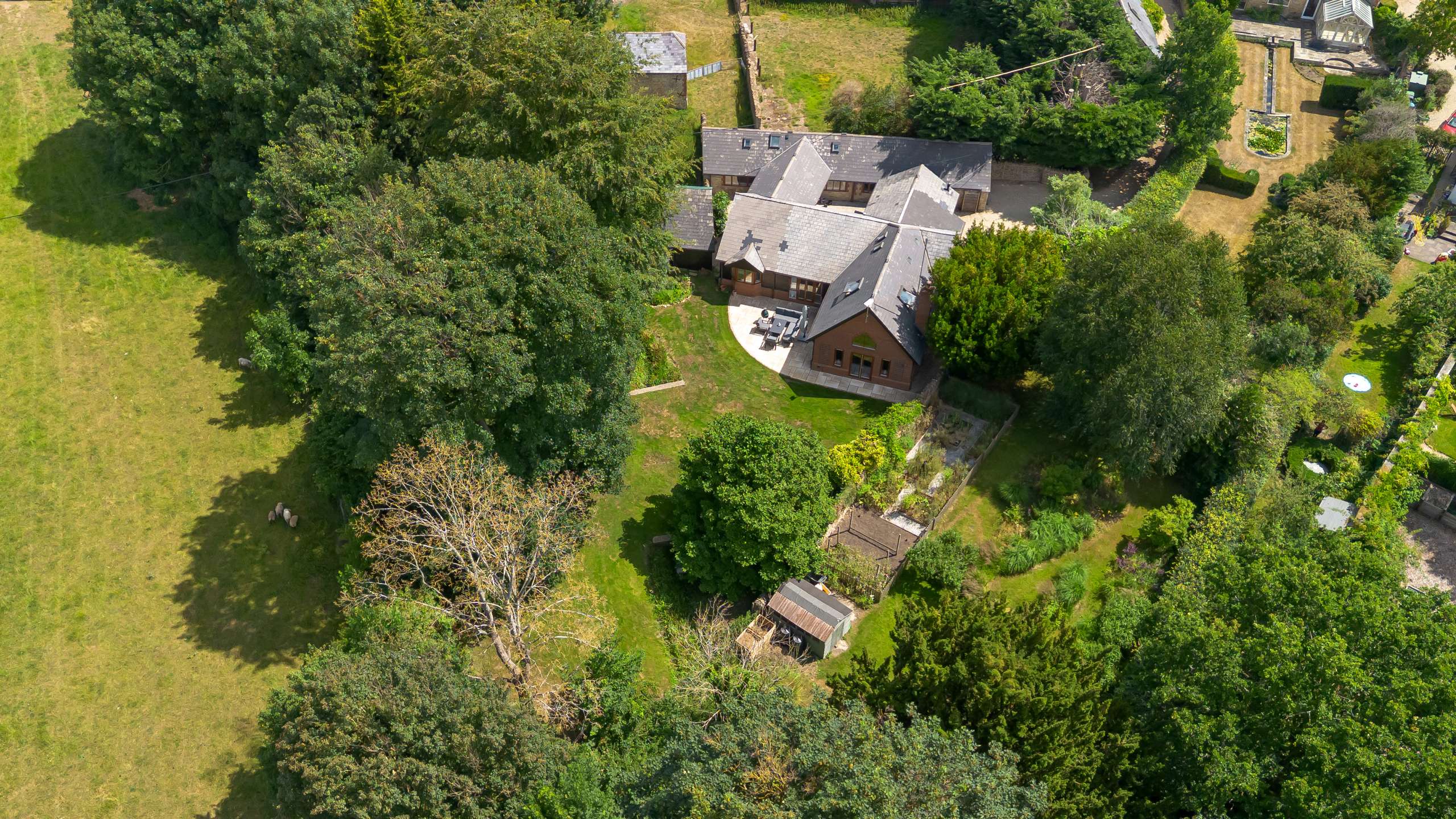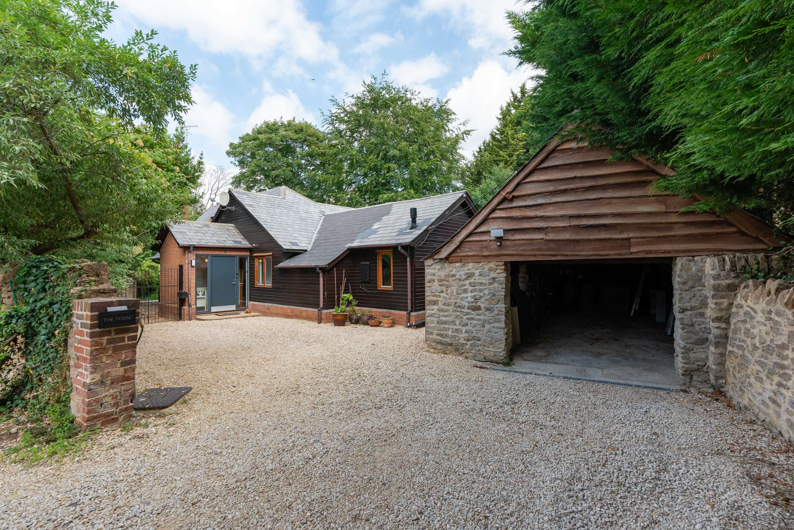 • Beautiful mature rear gardens, with patio, lawn, stream, bushes, flowers and trees.