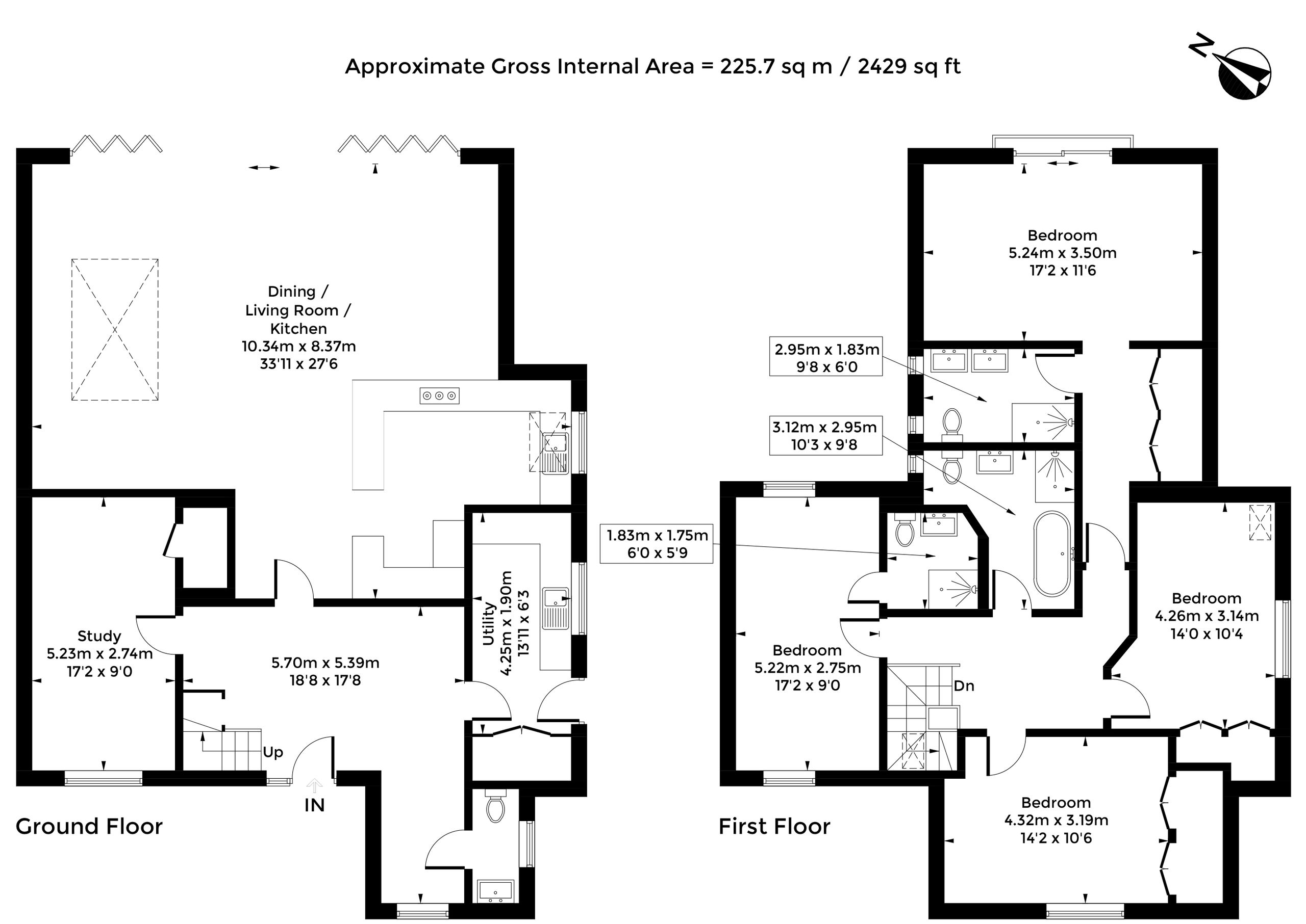 Upstairs, the first floor offers four well-proportioned bedrooms. The principal suite features a stylish en-suite bathroom and excellent storage, while the remaining bedrooms are served by a contemporary family bathroom and further ensuite. The layout provides flexible accommodation ideal for growing families or visiting guests.